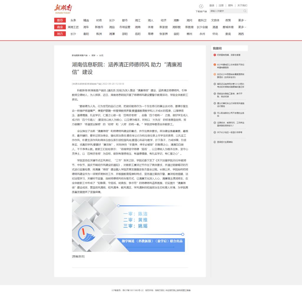 9月20日,新湖南发布《湖南信息职院:涵养清正师德师风 助力“清廉湘信”建设》