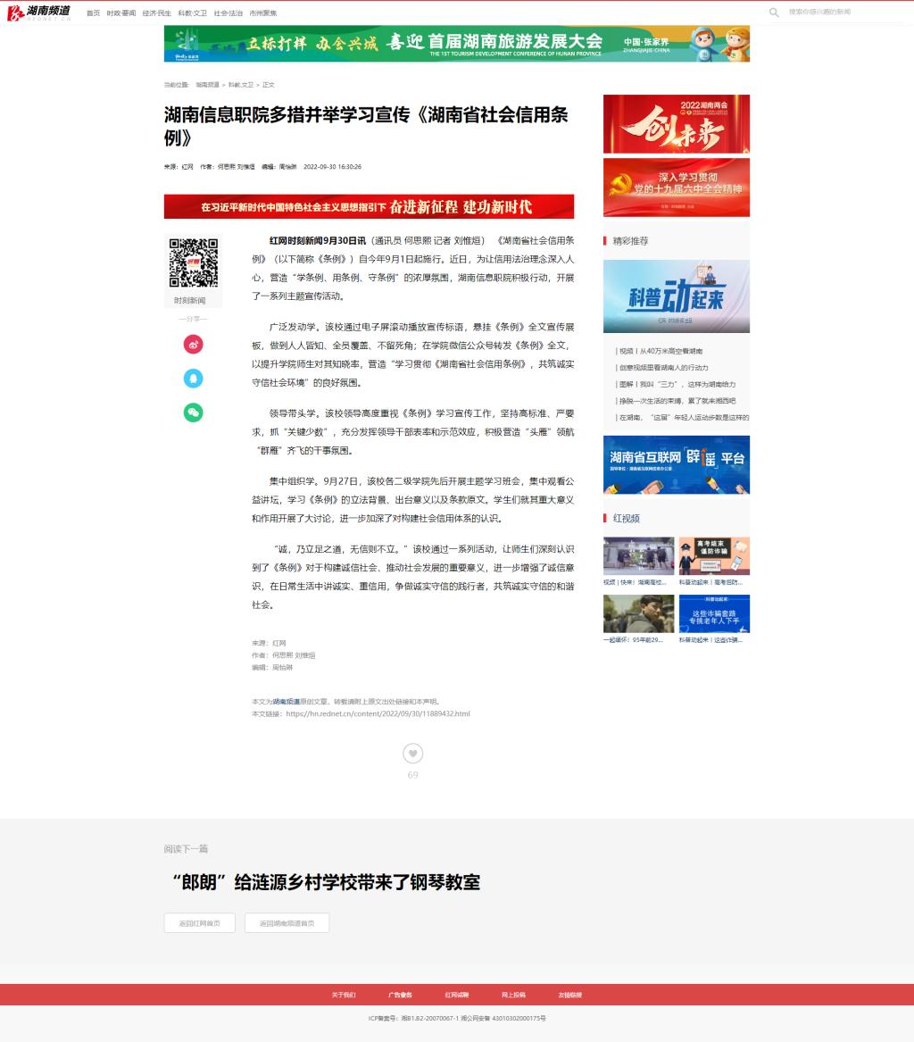 9月30日,红网时刻发布《湖南信息职院:筑信用之基 多措并举学习宣传<湖南省社会信用条例>》