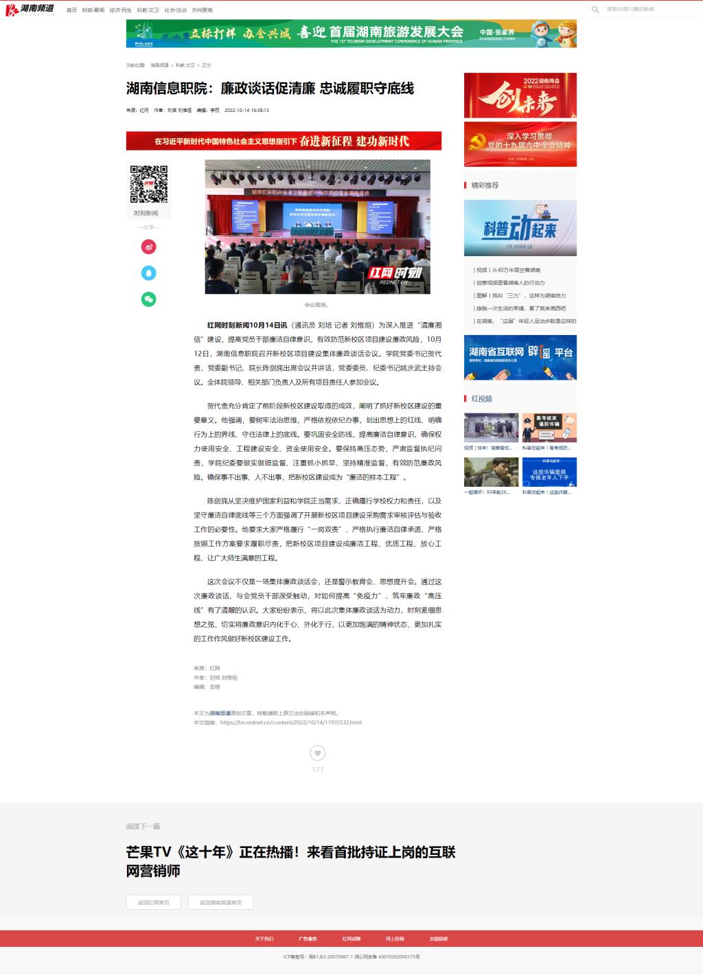 10月14日,红网时刻发布《湖南信息职院:廉政谈话促清廉 忠诚履职守底线》