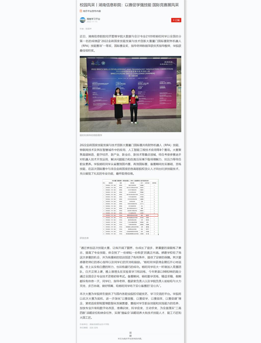 11月15日,学习强国发布《校园风采丨湖南信息职院:以赛促学强技能国际竞赛展风采》