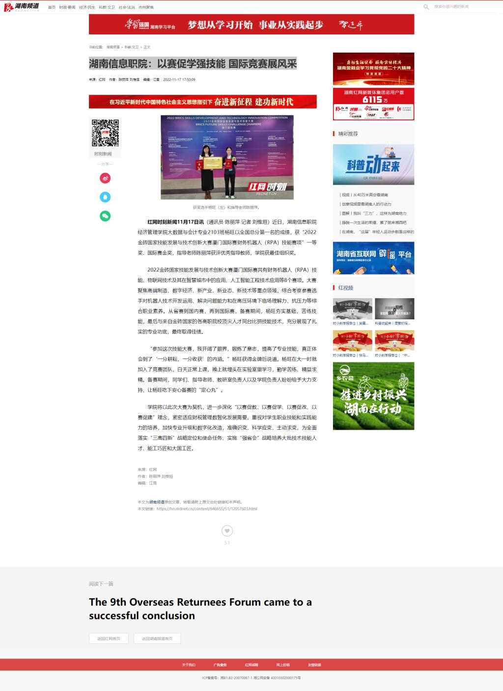 11月17日,红网发布《湖南信息职院:以赛促学强技能国际竞赛展风采》
