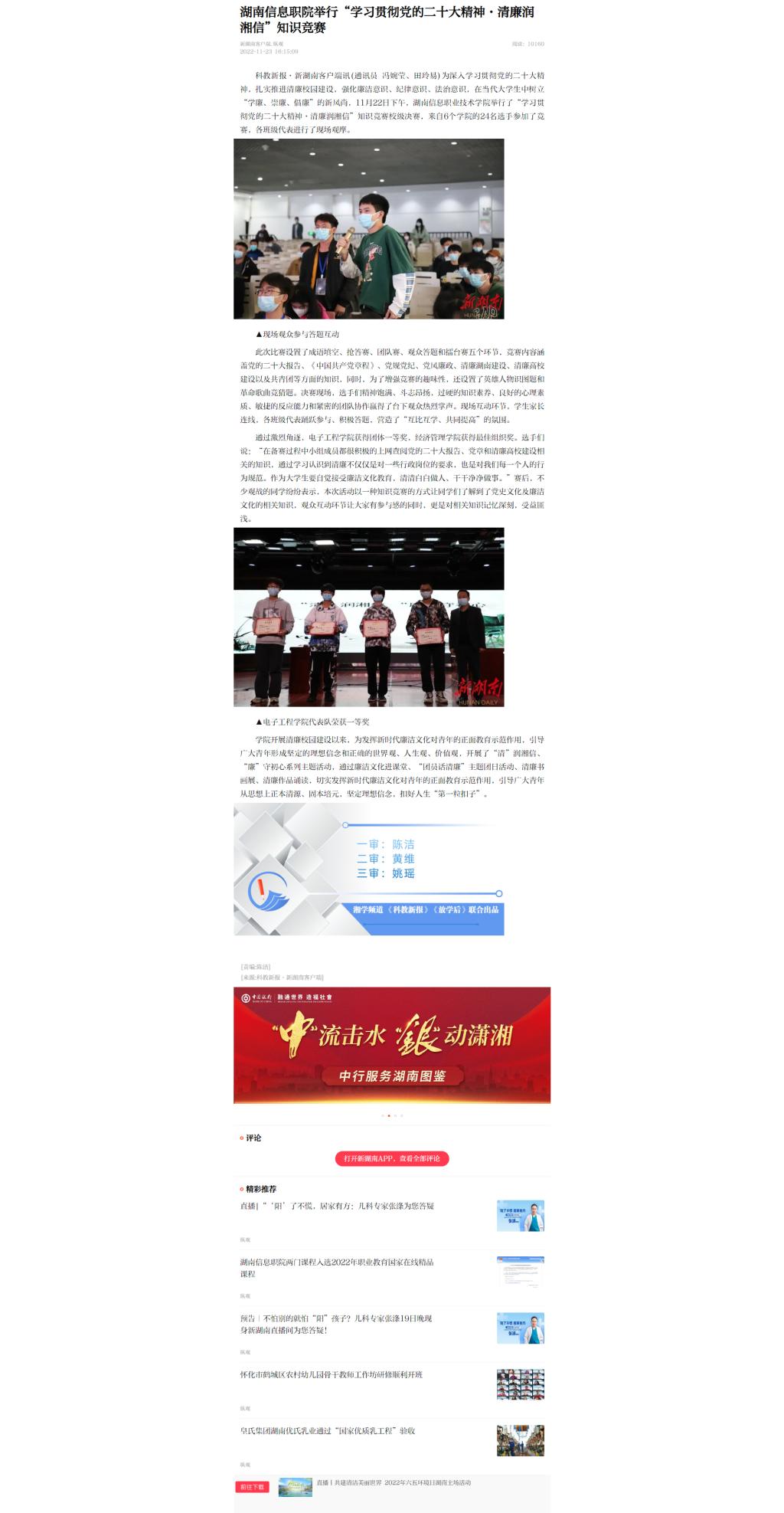 11月23日,新湖南发布《湖南信息职院举行“学习贯彻党的二十大精神·清廉润湘信”知识竞赛》