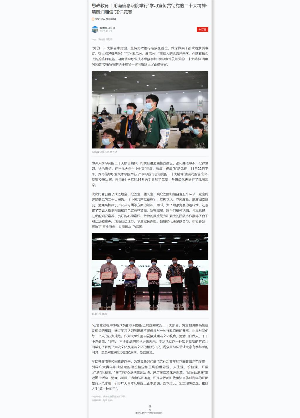 11月23日,学习强国发布《思政教育丨湖南信息职院举行“学习宣传贯彻党的二十大精神·清廉润湘信”知识竞赛》