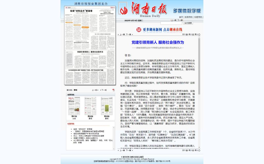 12月13日,湖南日报发布《党建引领育新人 服务社会强作为——best365手机版官方网站职业教育发展改革成果巡礼之一》