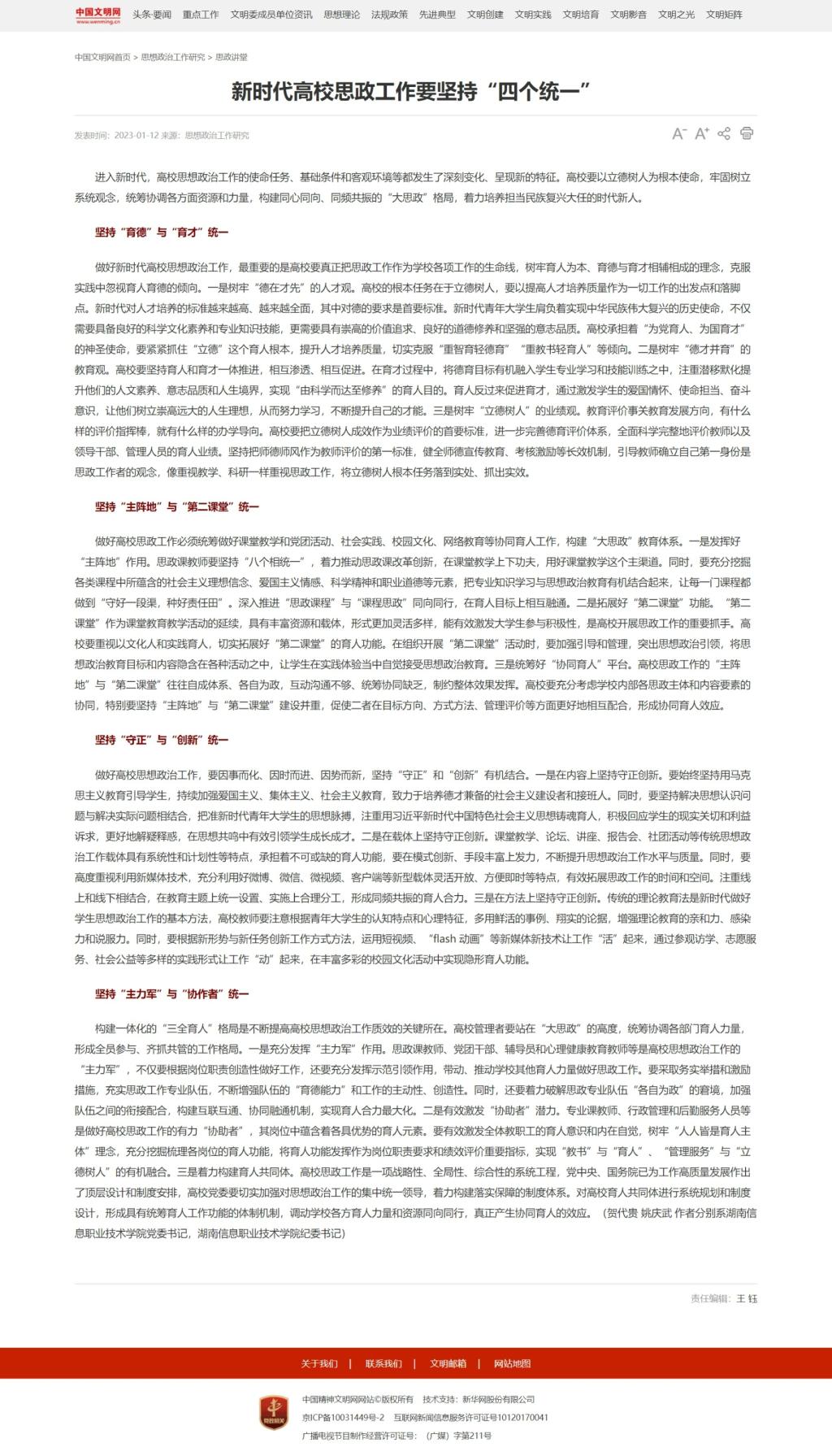 1月12日,中国文明网发布《新时代高校思政工作要坚持“四个统一”》