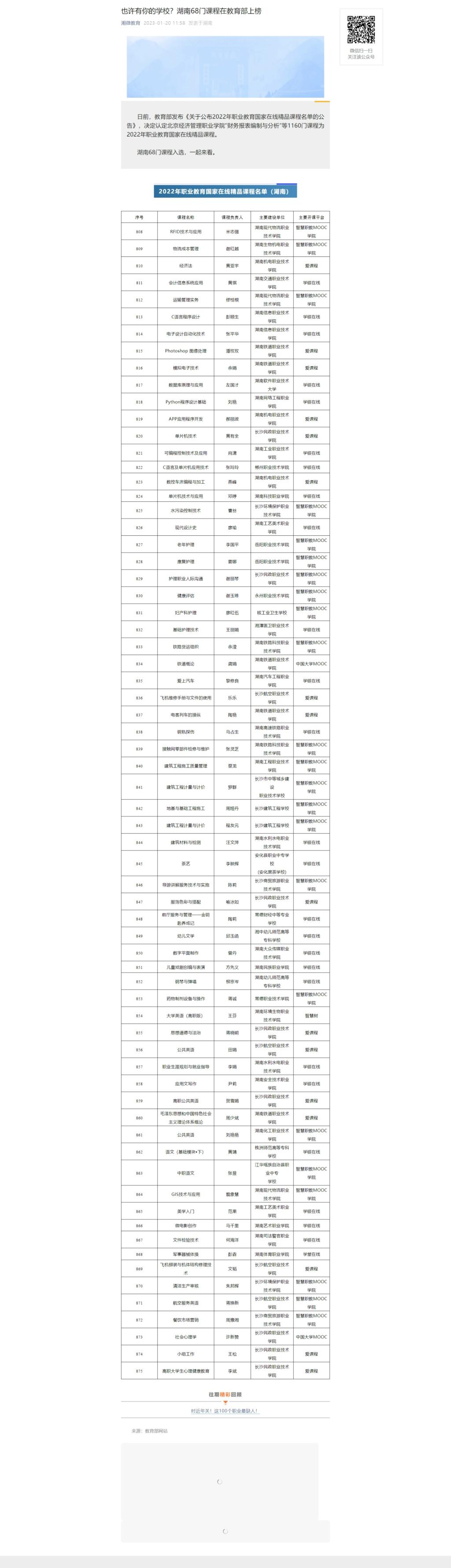 1月20日,微信(湘微教育)发布《也许有你的学校?湖南68门课程在教育部上榜》