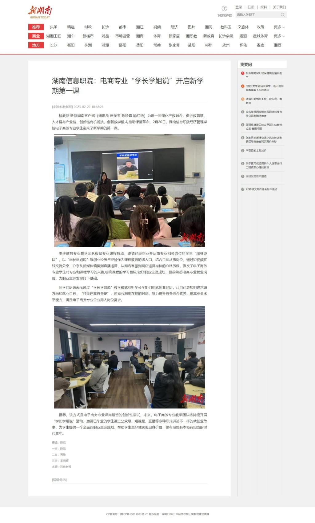 2月22日,新湖南发布《湖南信息职院:电商专业“学长学姐说”开启新学期第一课》