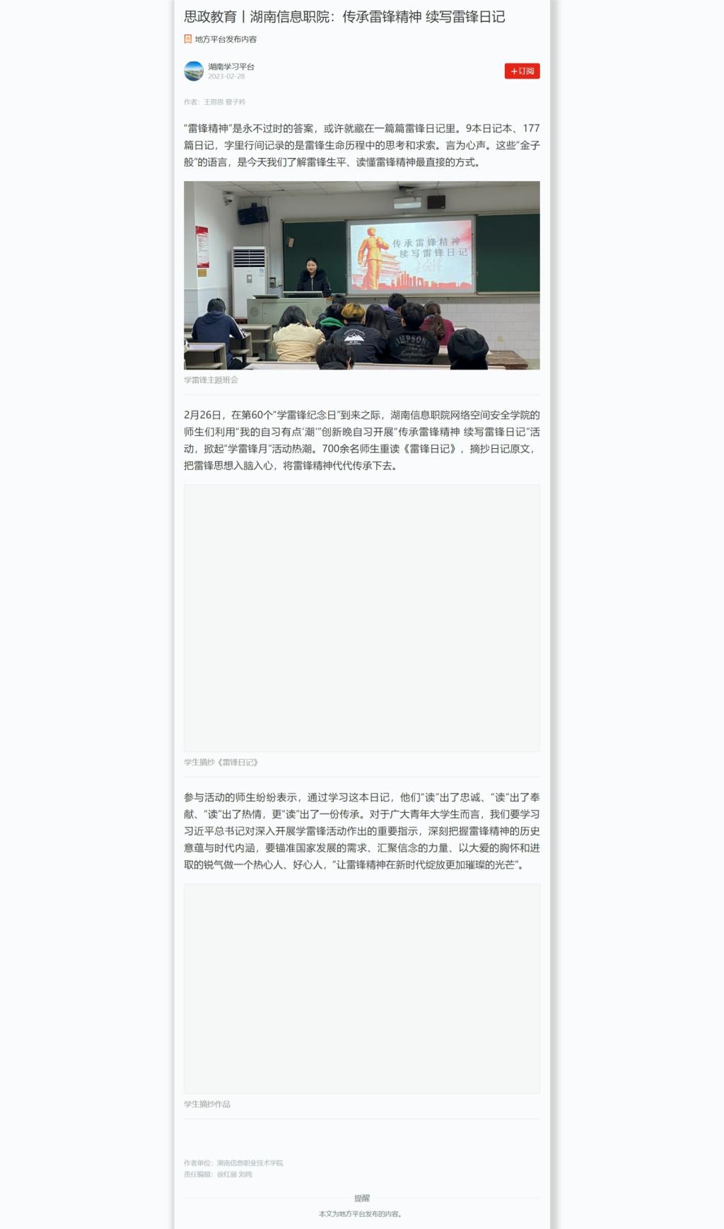 2月28日,学习强国发布《思政教育丨湖南信息职院:传承雷锋精神 续写雷锋日记》