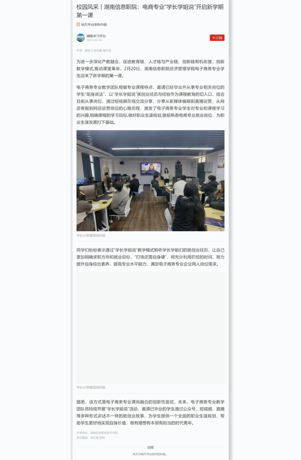 2月28日,学习强国发布《校园风采丨湖南信息职院:电商专业“学长学姐说”开启新学期第一课》