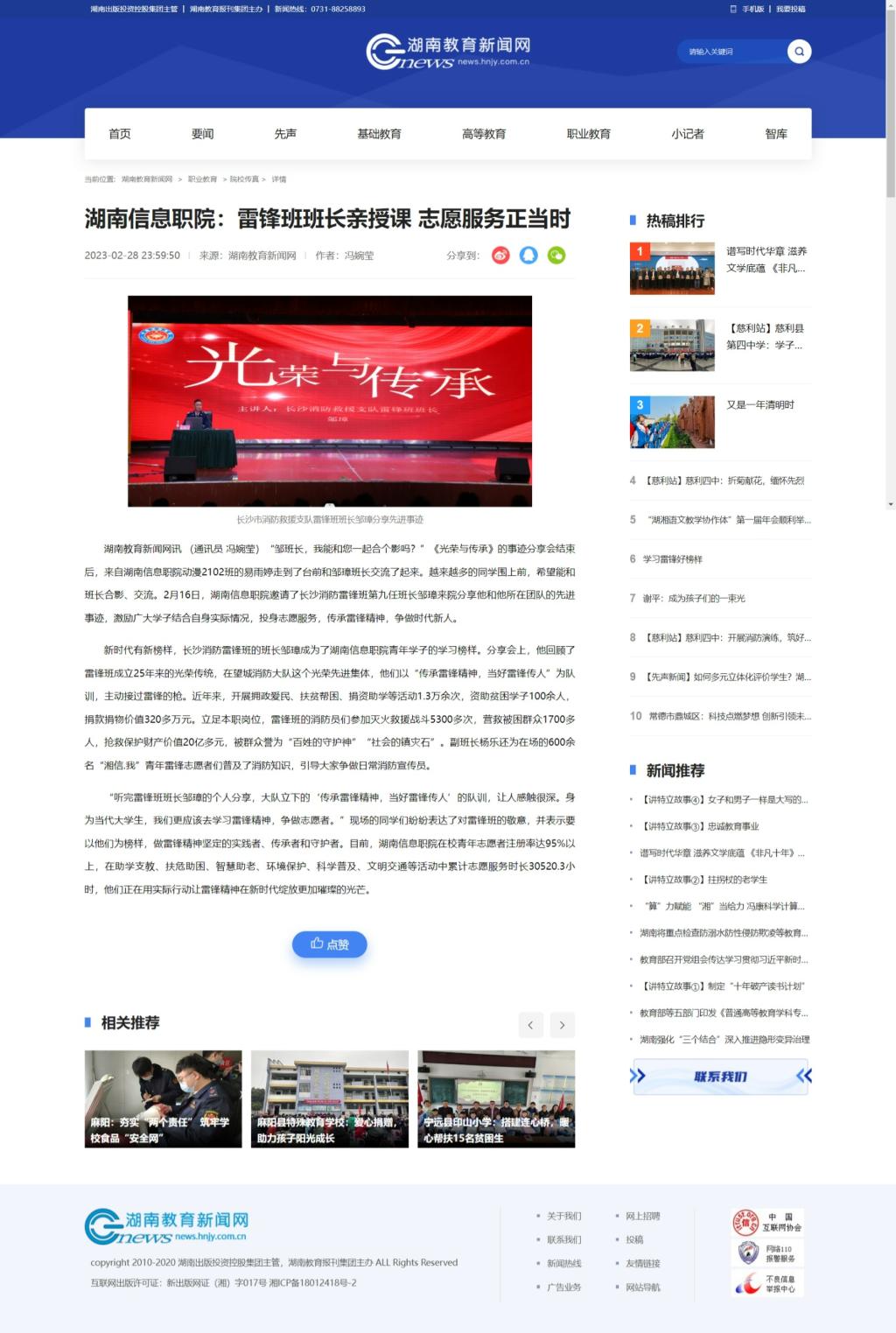 2月28日,湖南教育新闻网发布《湖南信息职院:雷锋班长亲授课 志愿服务正当时》