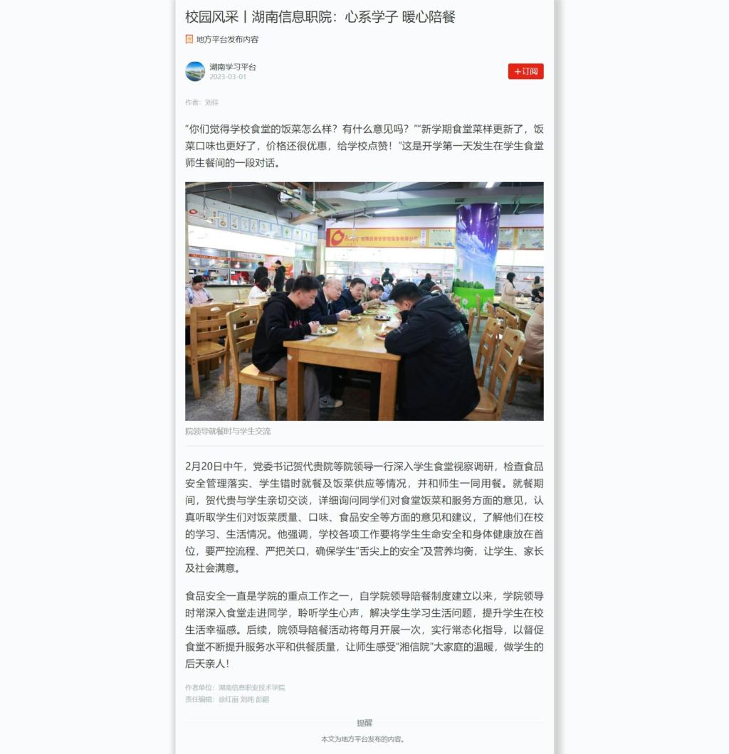 3月1日,学习强国发布《校园风采丨湖南信息职院:心系学子 暖心陪餐》