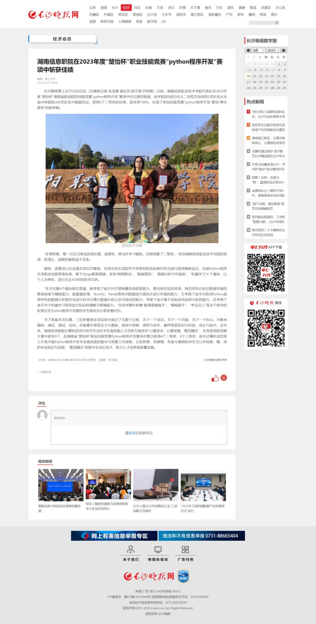 3月7日,长沙晚报网发布《湖南信息职院在2023年度“楚怡杯”职业技能竞赛“python程序开发”赛项中斩获佳绩》
