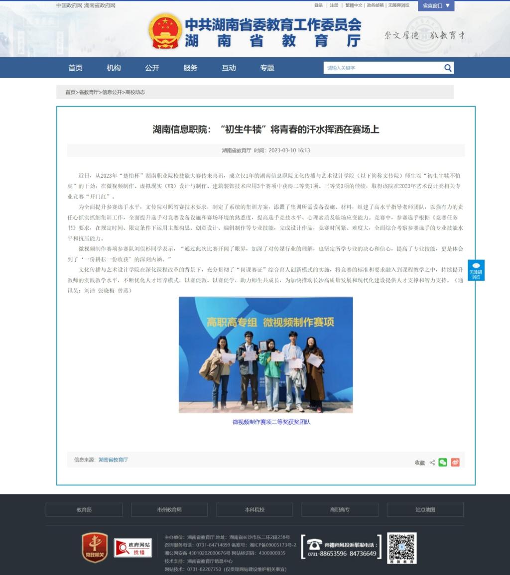3月10日,湖南省教育厅发布《湖南信息职院:“初生牛犊”将青春的汗水挥洒在赛场上》