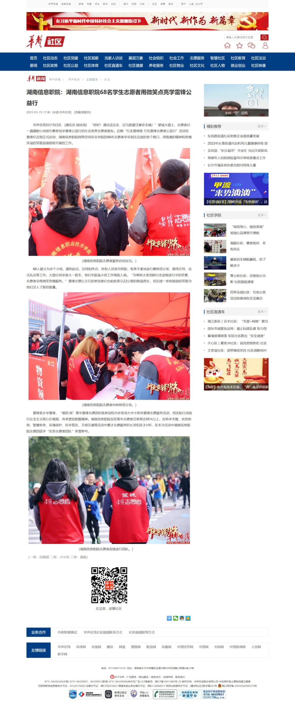 3月15日,华声在线发布《湖南信息职院:湖南信息职院68名学生志愿者用微笑点亮学雷锋公益行》