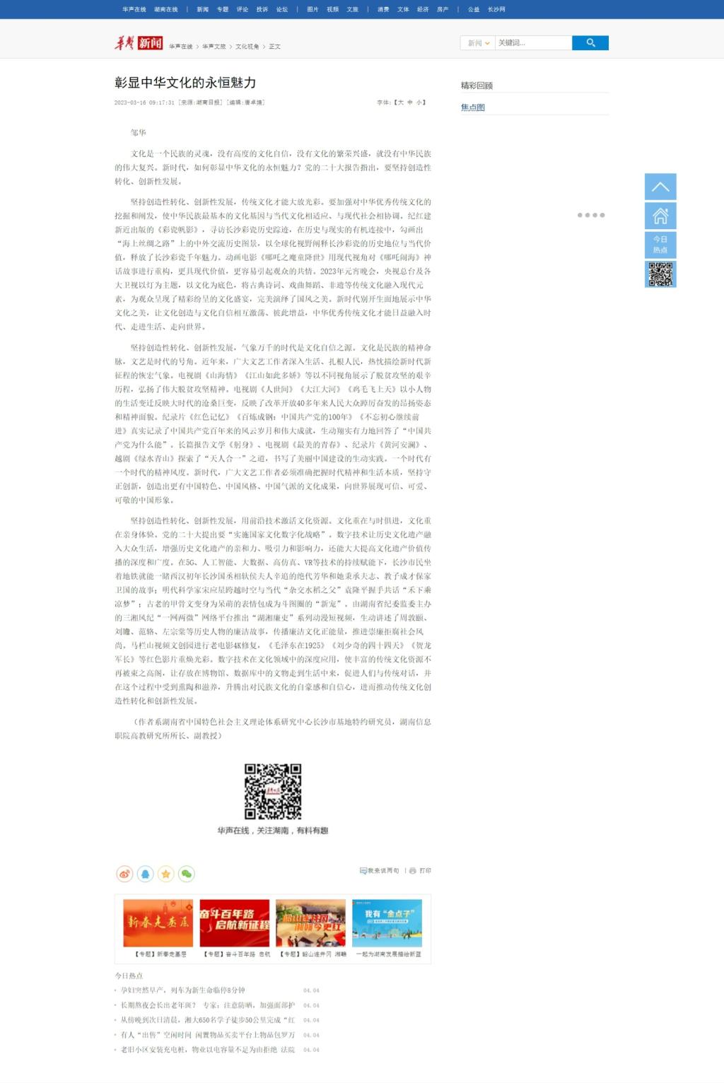 3月16日,华声在线发布《彰显中华文化的永恒魅力》
