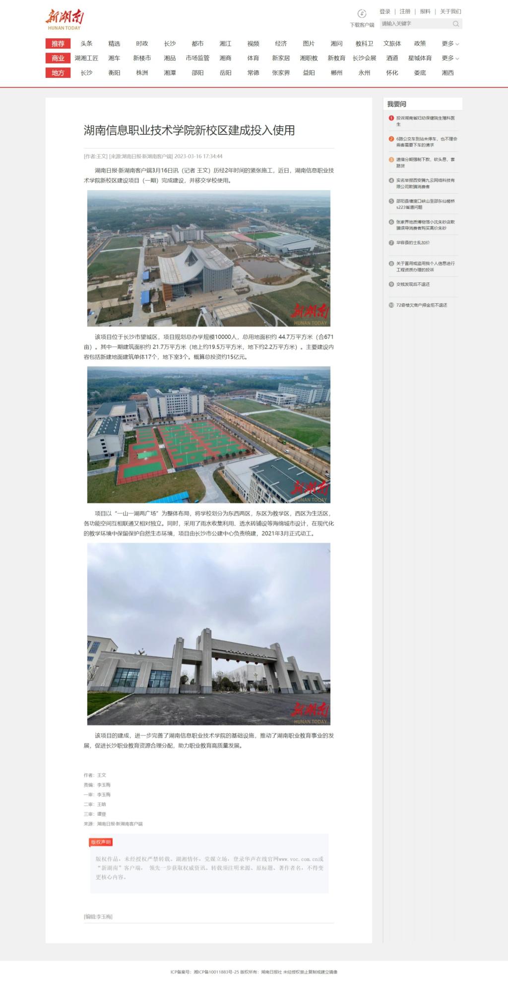 3月16日,新湖南发布《best365手机版官方网站新校区建成投入使用》