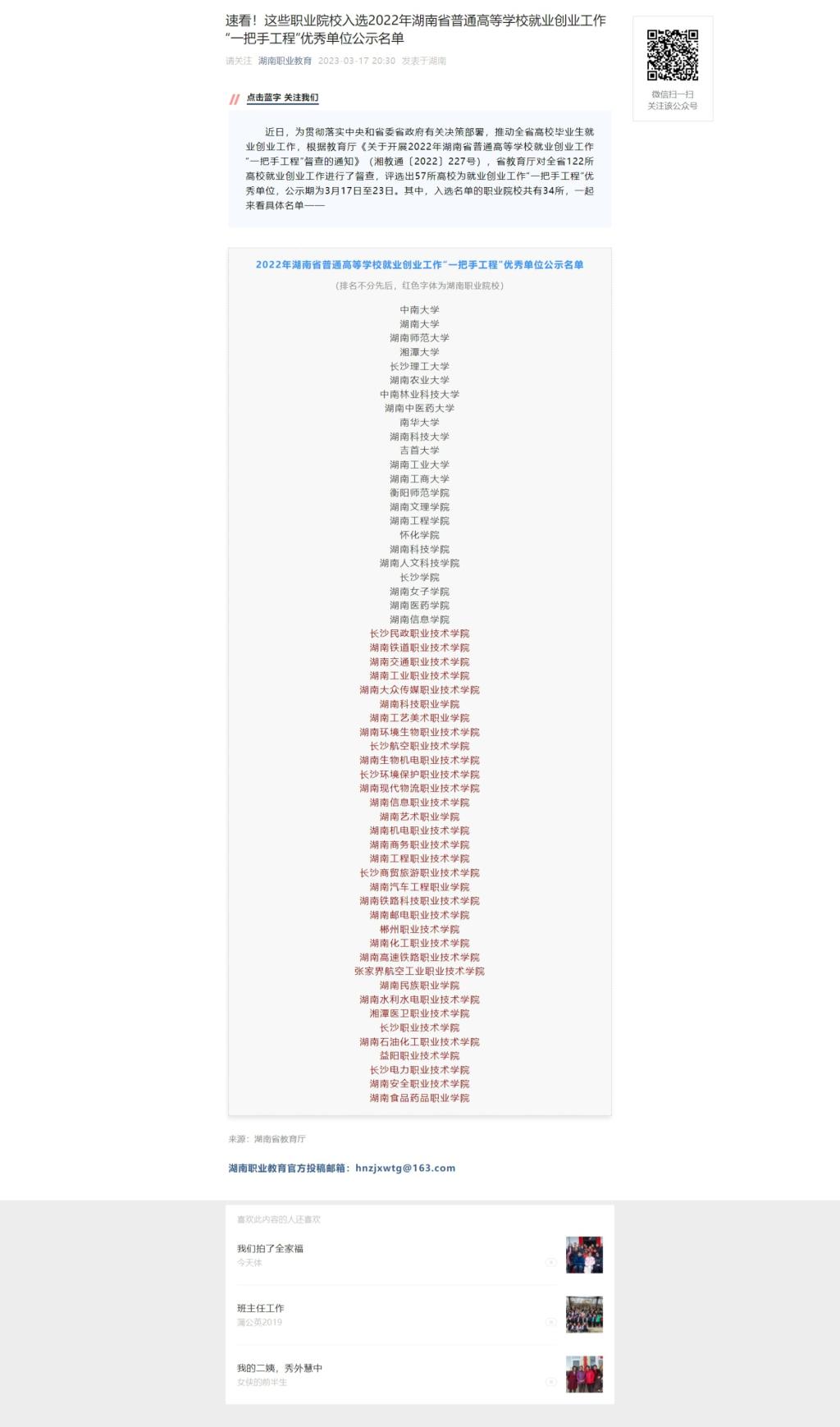 3月17日,微信(湖南职业教育)发布《速看!这些职业院校入选2022年湖南省普通高等学校就业创业工作“一把手工程”优秀单位公示名单》