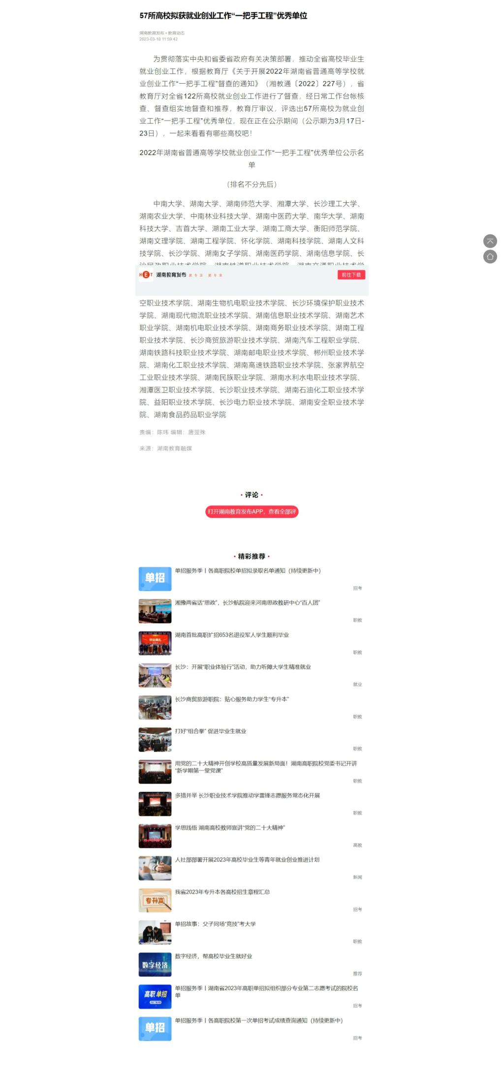 3月18日,湖南教育发布客户端发布《57所高校拟获就业创业工作“一把手工程”优秀单位》