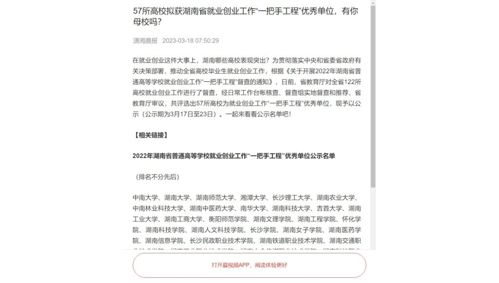 3月18日,晨视频发布《57所高校拟获湖南省就业创业工作“一把手工程”优秀单位,有你母校吗?》