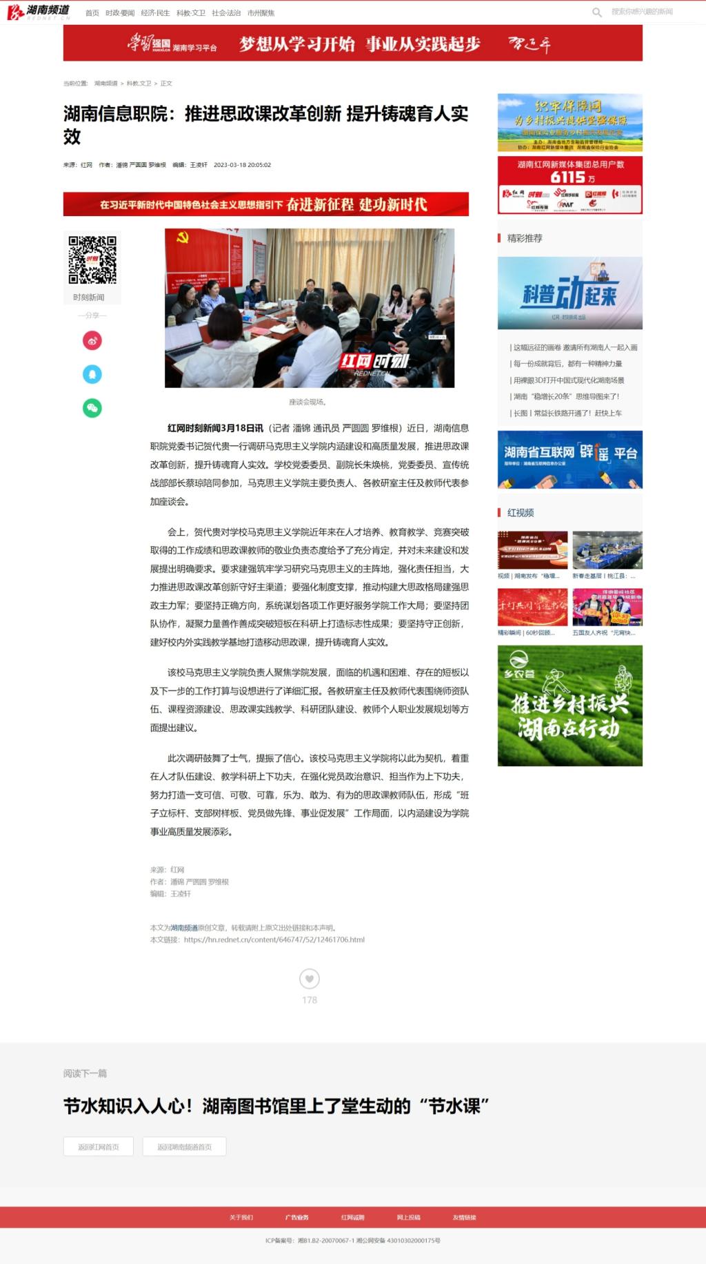 3月18日,红网发布《湖南信息职院:推进思政课改革创新 提升铸魂育人实效》