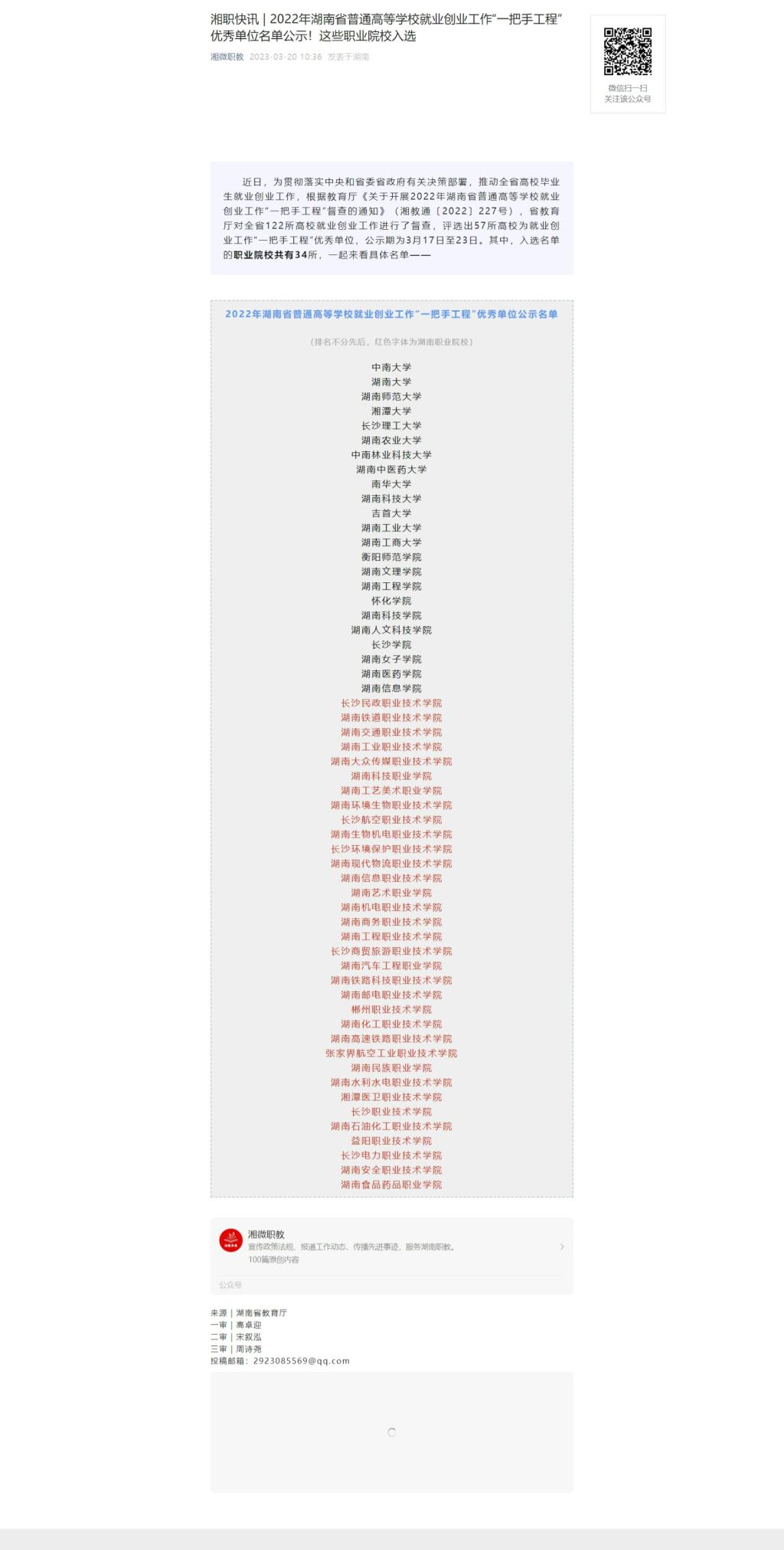 3月20日,微信(湘微职教)发布《湘职快讯 | 2022年湖南省普通高等学校就业创业工作“一把手工程”优秀单位名单公示!这些职业院校入选》
