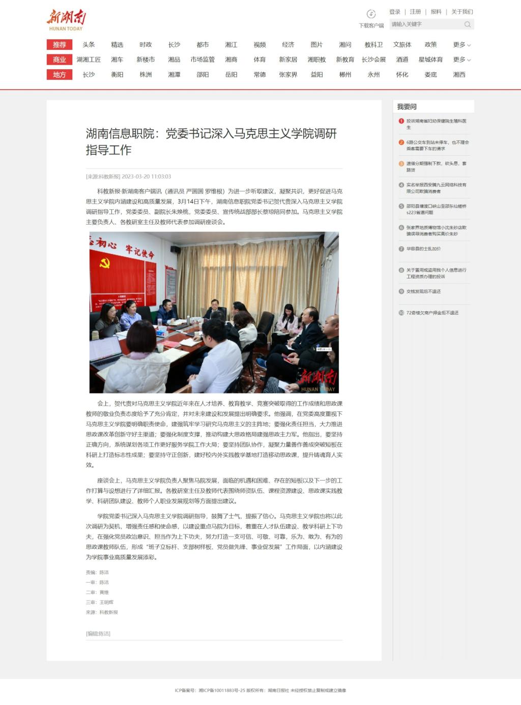 3月20日,新湖南发布《湖南信息职院:党委书记深入马克思主义学院调研指导工作》