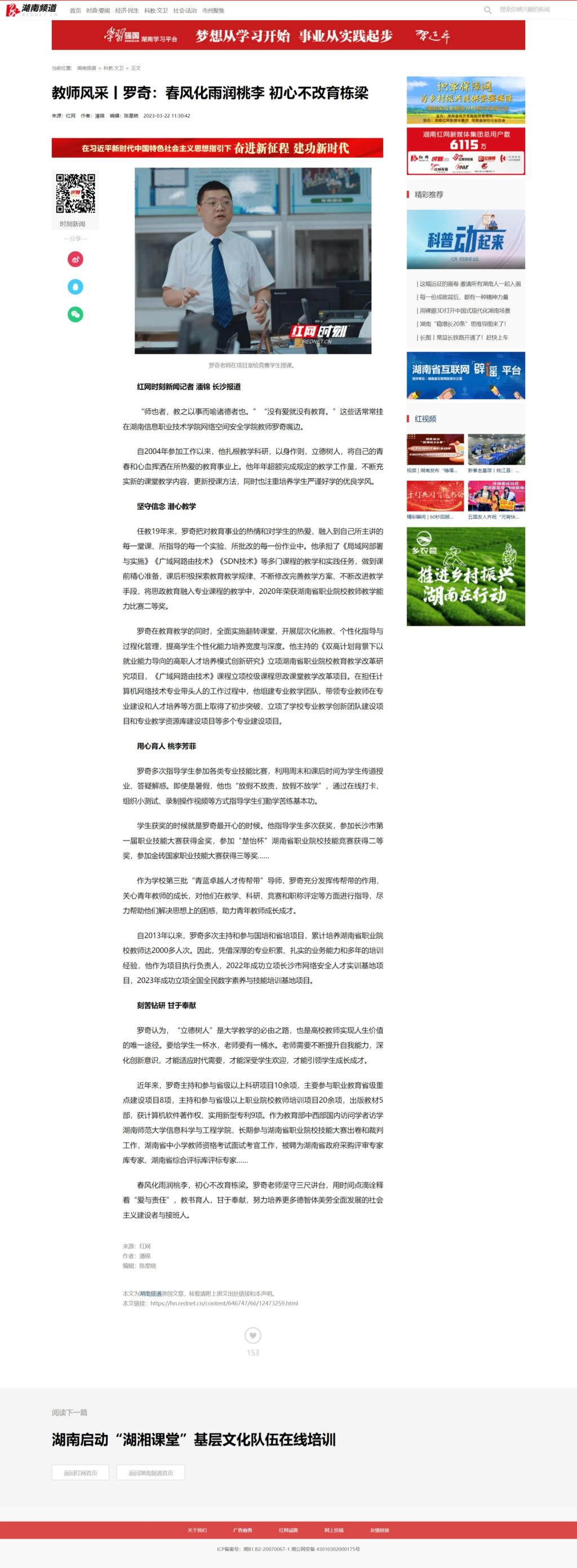 3月22日,红网发布《教师风采丨罗奇:春风化雨润桃李 初心不改育栋梁》