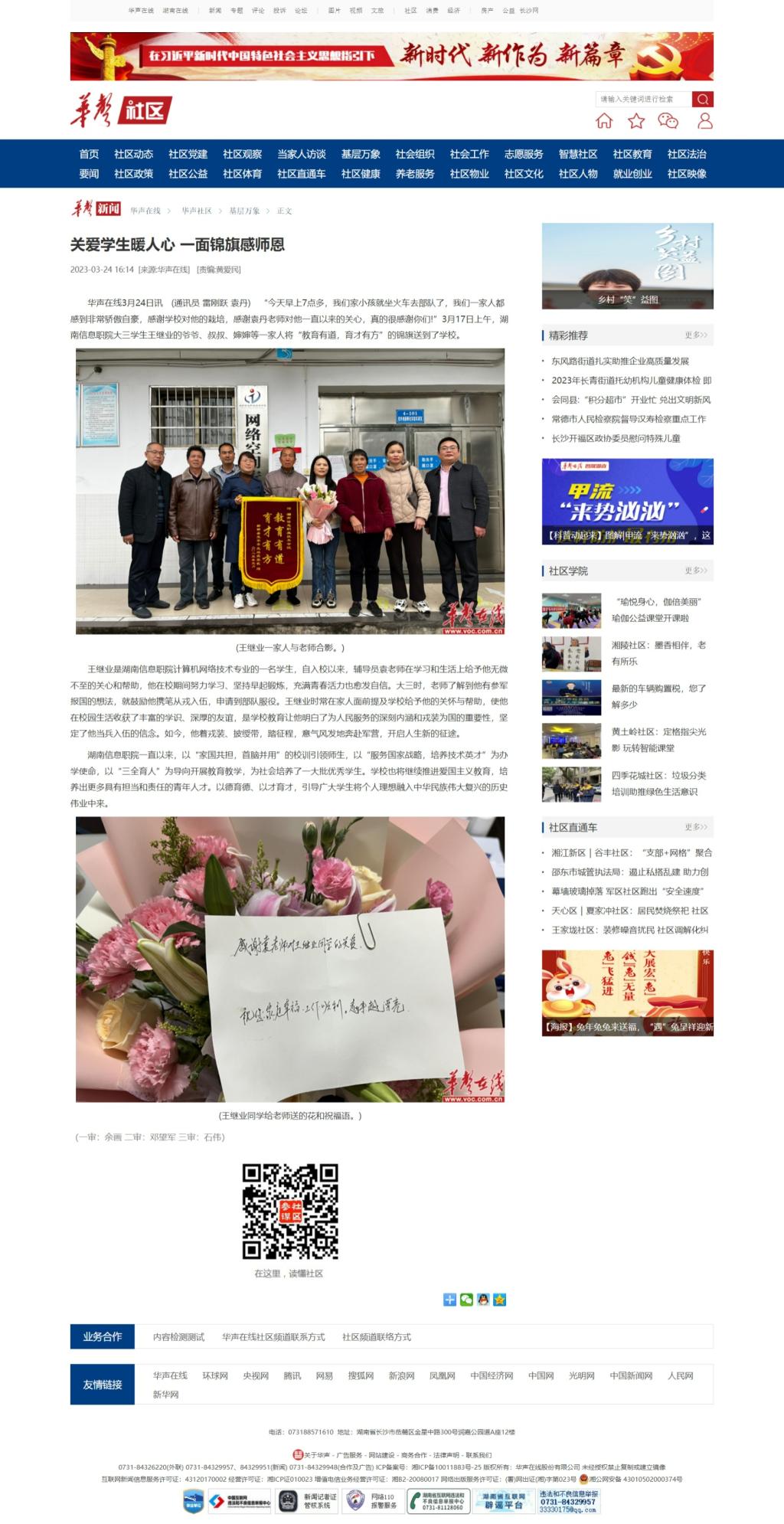 3月24日,华声在线发布《关爱学生暖人心 一面锦旗感师恩》