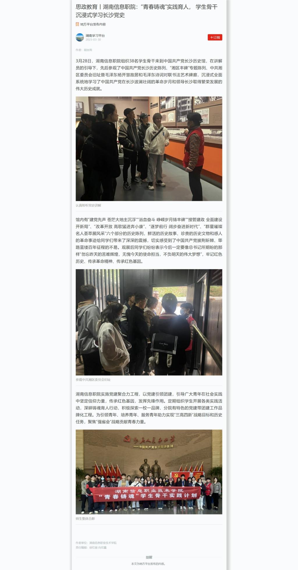 3月30日,学习强国发布《思政教育丨湖南信息职院:“青春铸魂”实践育人, 学生骨干沉浸式学习长沙党史》