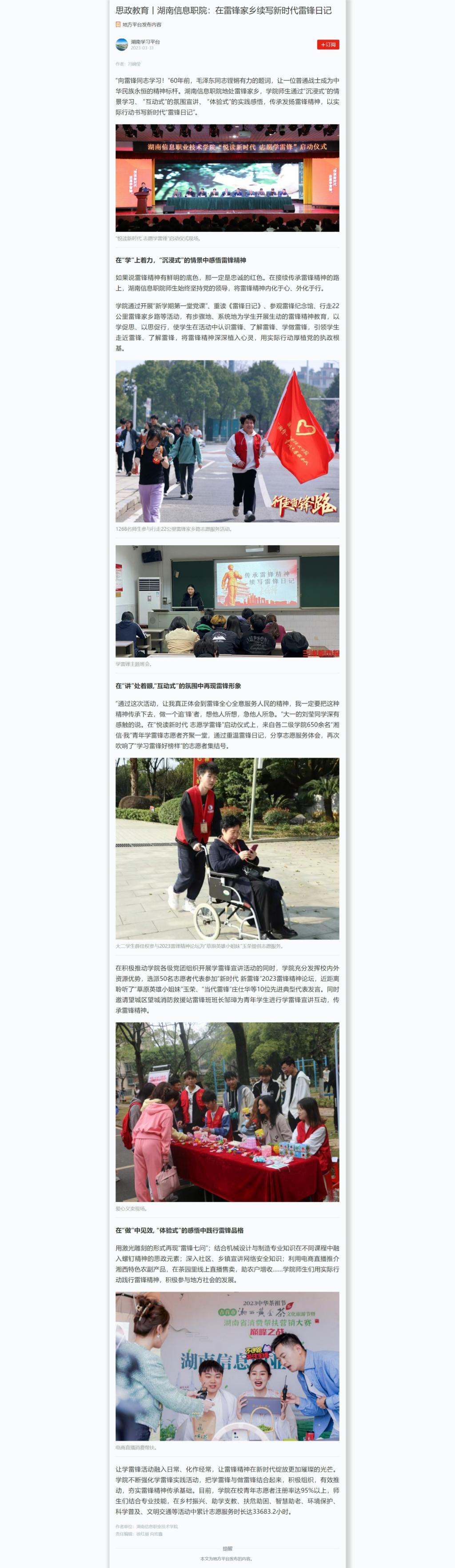 3月31日,学习强国发布《思政教育丨湖南信息职院:在雷锋家乡续写新时代雷锋日记》