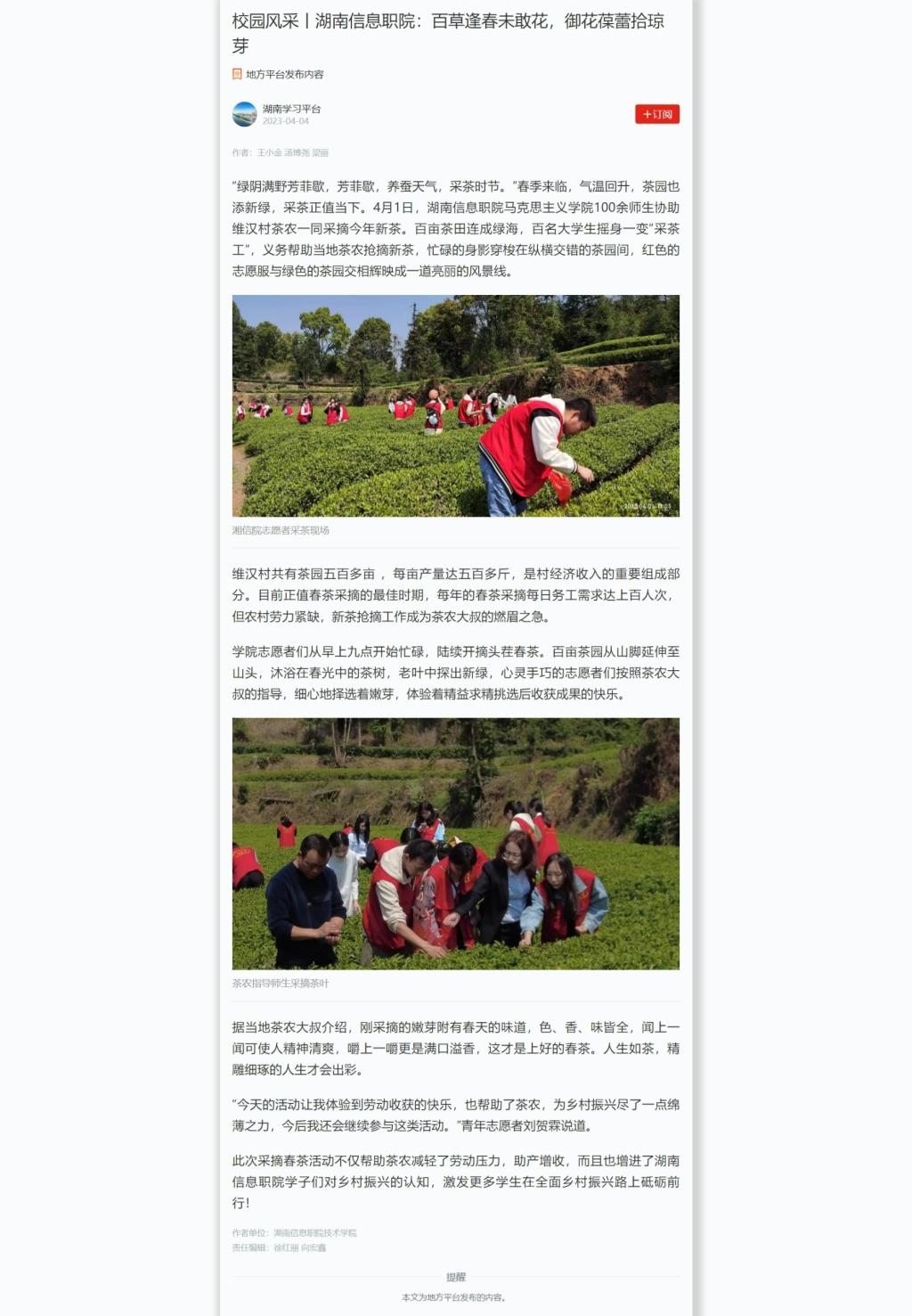 4月4日,学习强国发表《校园风采丨湖南信息职院:百草逢春未敢花,御花葆蕾拾琼芽》
