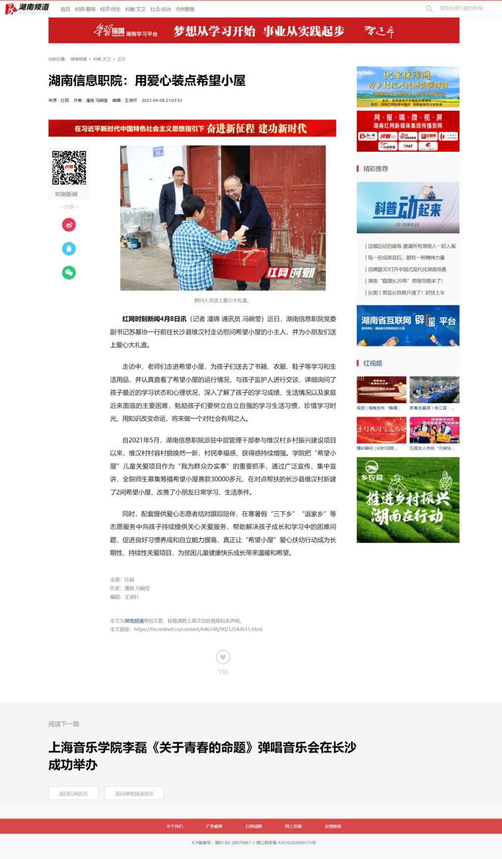 4月8日,红网发表《湖南信息职院:用爱心装点希望小屋》