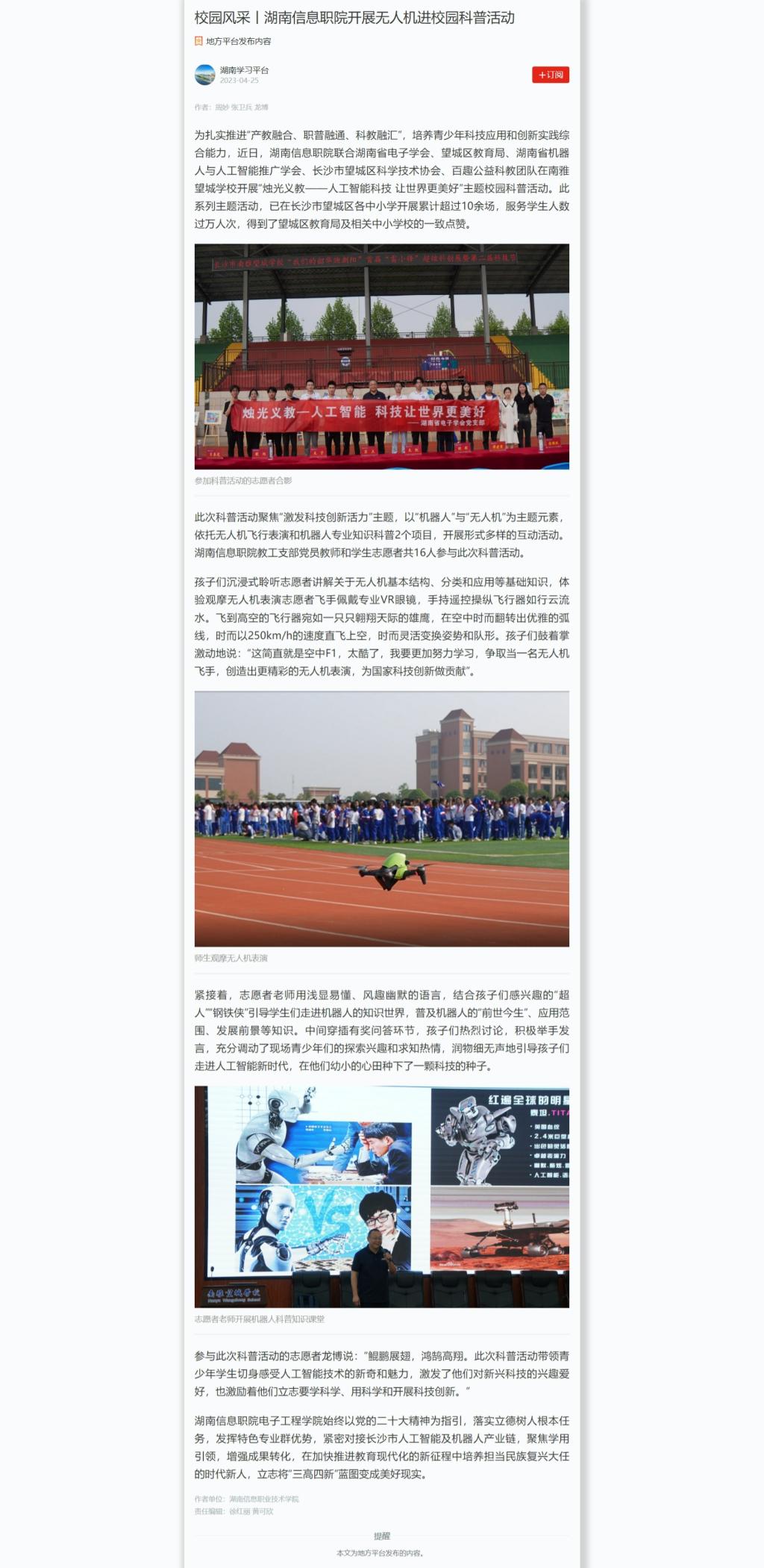 4月25日,学习强国发表《校园风采丨湖南信息职院开展无人机进校园科普活动》