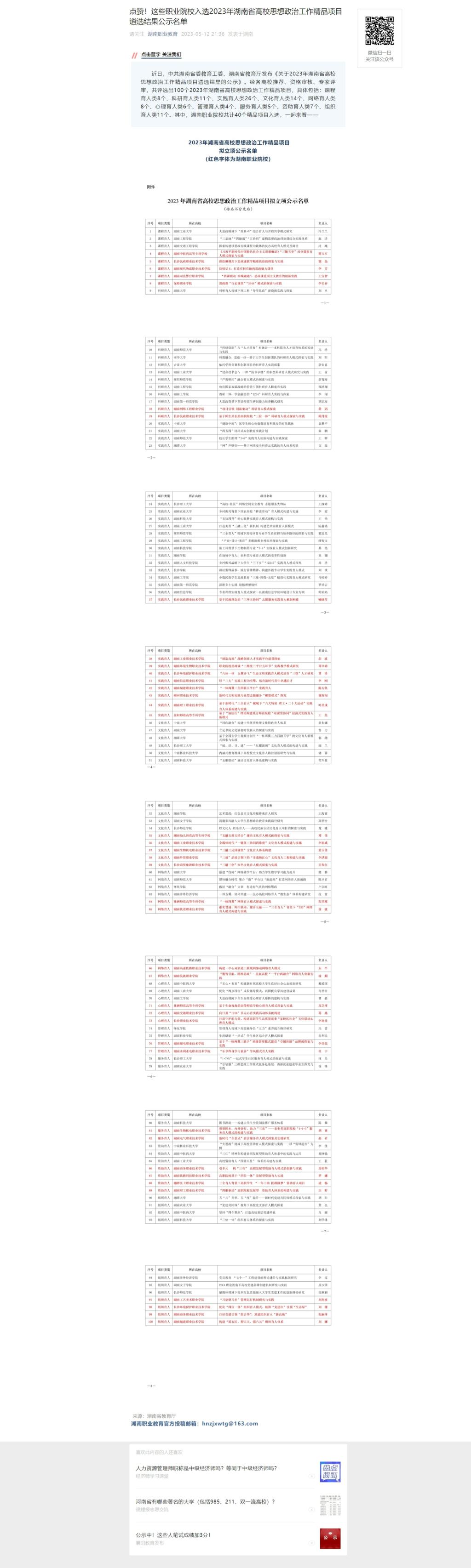 5月12日,微信(湖南职业教育)发布《点赞!这些职业院校入选2023年湖南省高校思想政治工作精品项目遴选结果公示名单》