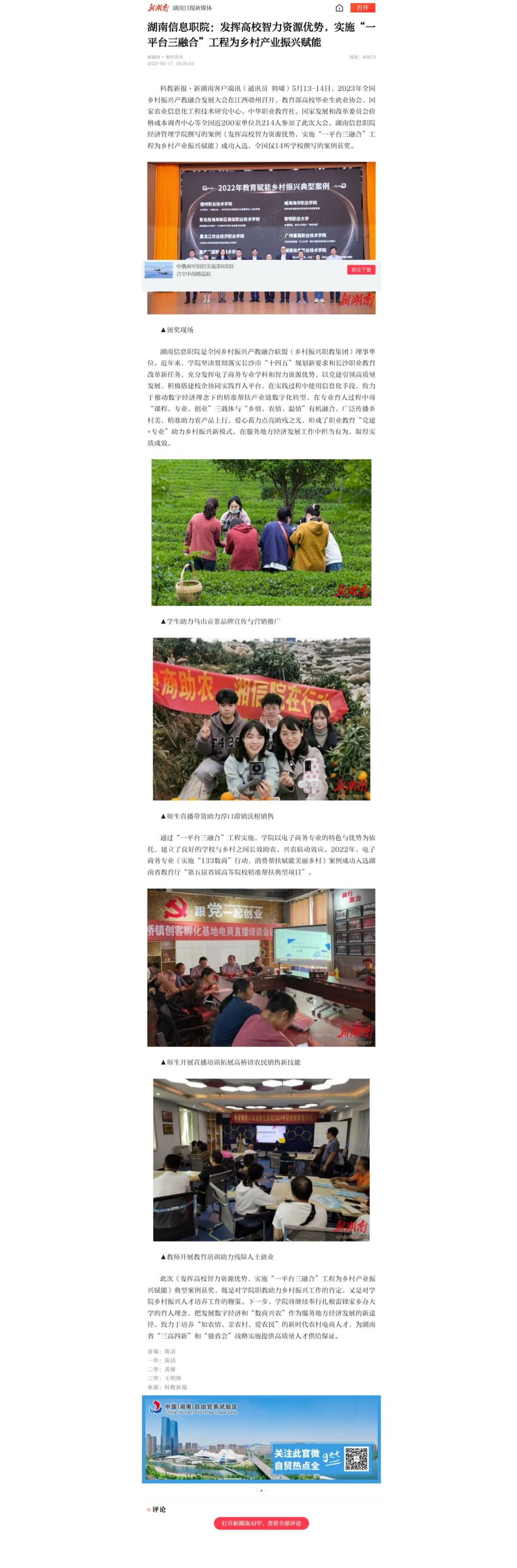 5月17日,新湖南客户端发布《湖南信息职院:发挥高校智力资源优势,实施“一平台三融合”工程为乡村产业振兴赋能》
