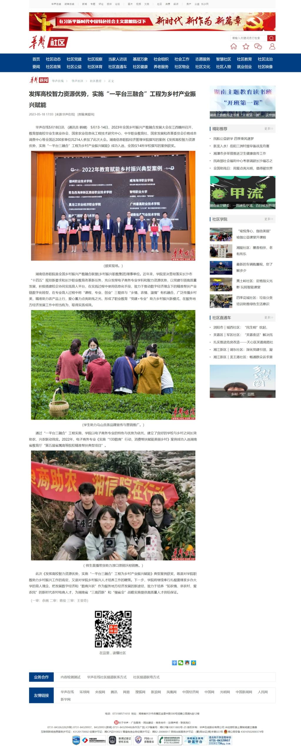 5月18日,华声在线发布《发挥高校智力资源优势,实施“一平台三融合”工程为乡村产业振兴赋能》