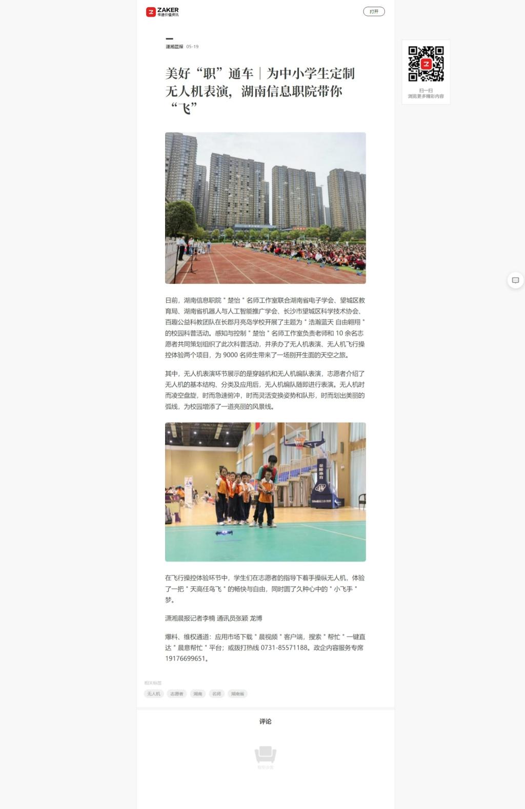 5月19日,ZAKER客户端发布《美好“职”通车|为中小学生定制无人机表演,湖南信息职院带你“飞”》