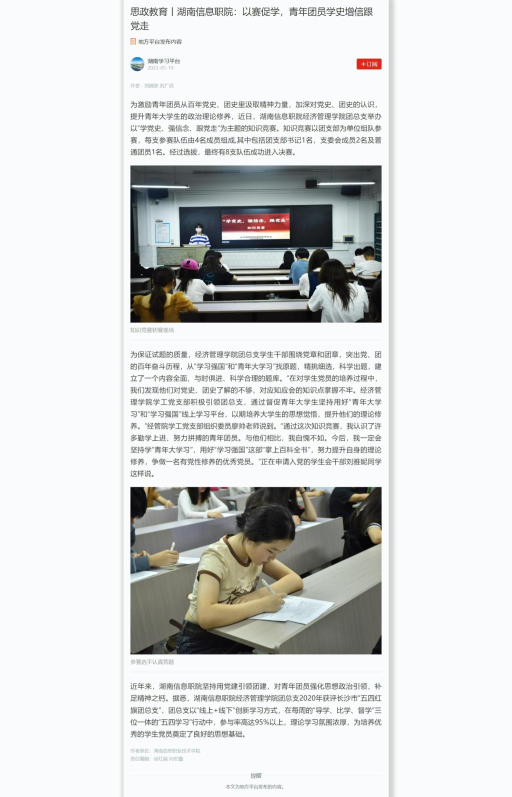 5月19日,学习强国发布《思政教育丨湖南信息职院:以赛促学,青年团员学史增信跟党走》