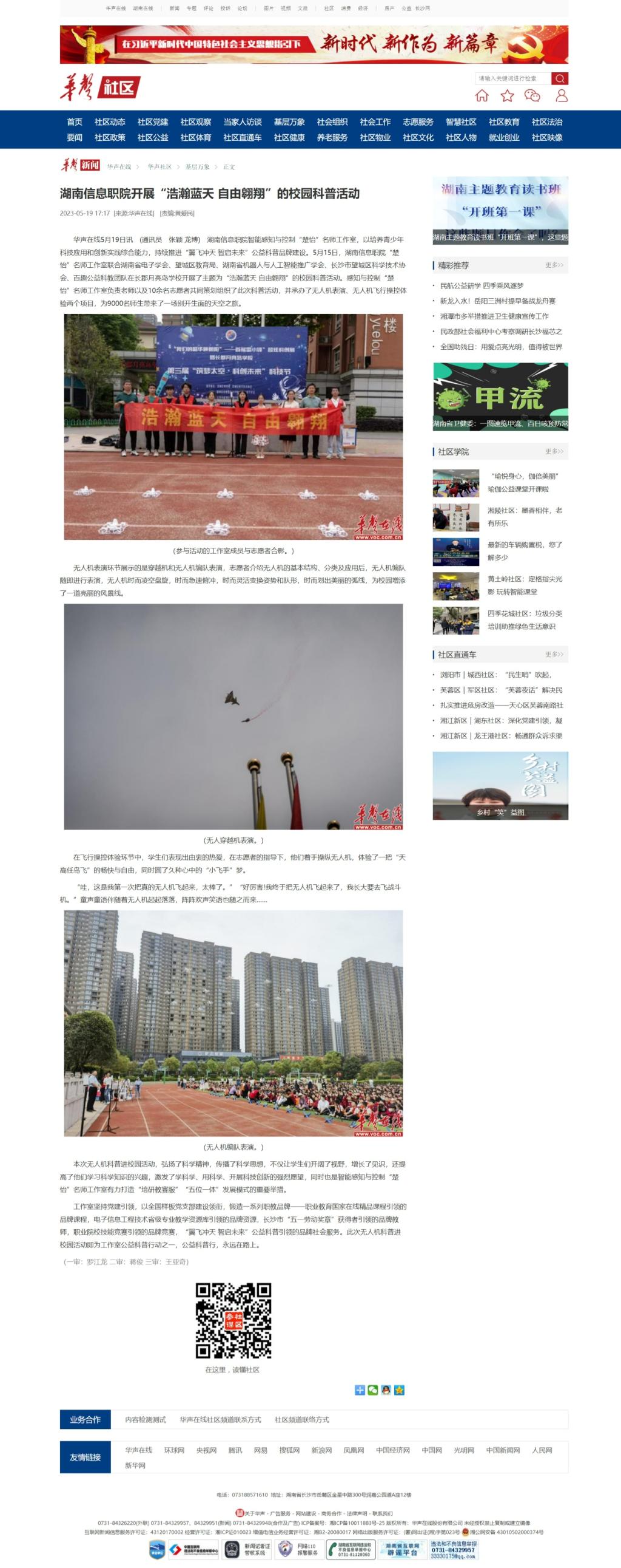 5月19日,华声在线发布《湖南信息职院开展“浩瀚蓝天 自由翱翔”的校园科普活动》