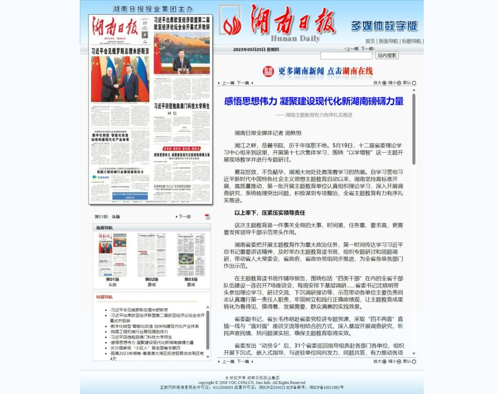 5月25日,湖南日报发布《感悟思想伟力 凝聚建设现代化新湖南磅礴力量》