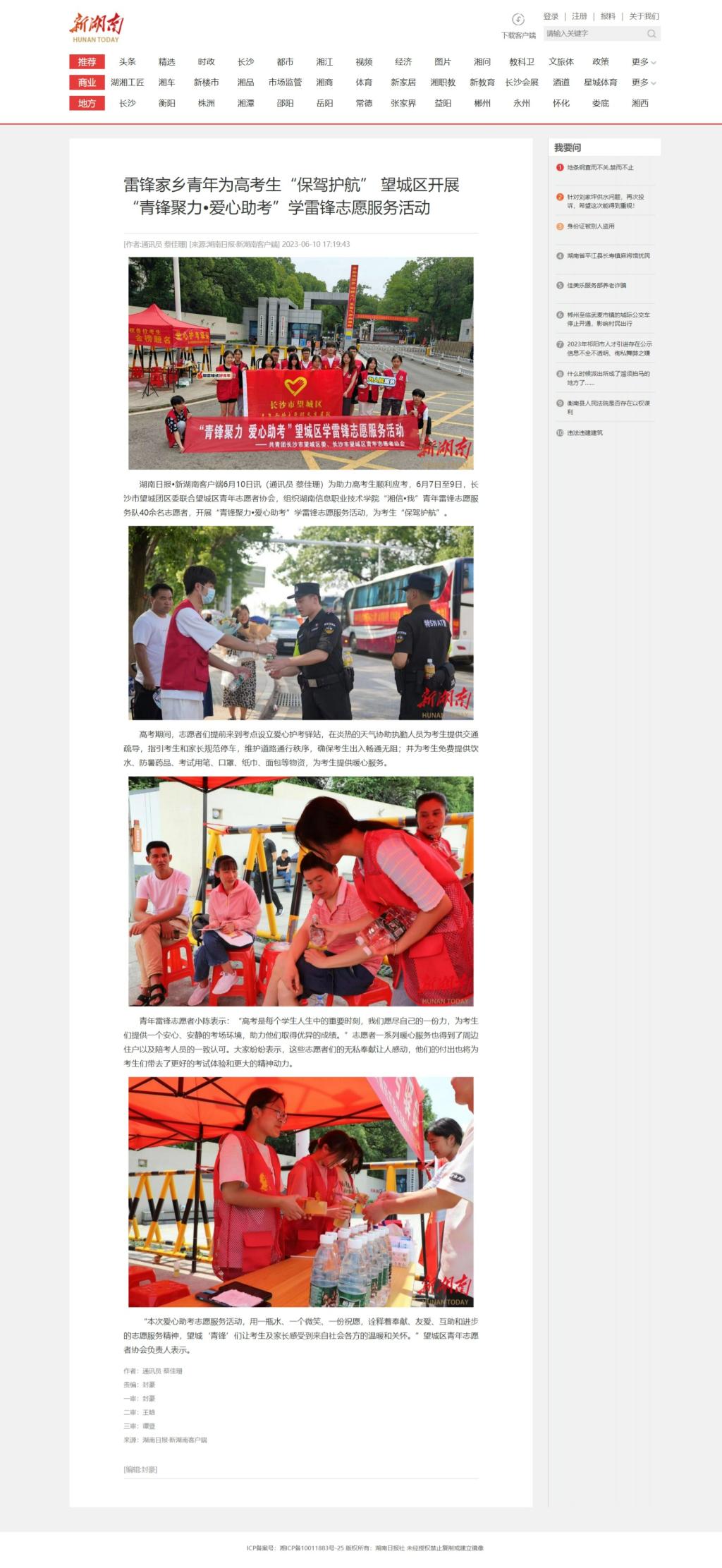 6月10日,新湖南发布《雷锋家乡青年为高考生“保驾护航” 望城区开展“青锋聚力•爱心助考”学雷锋志愿服务活动》