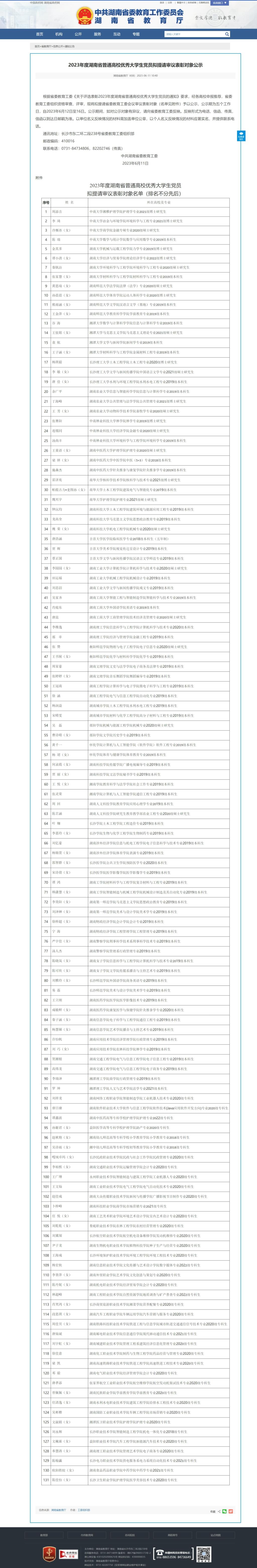 6月11日,湖南省教育厅发布《2023年度湖南省普通高校优秀大学生党员拟提请审议表彰对象公示》