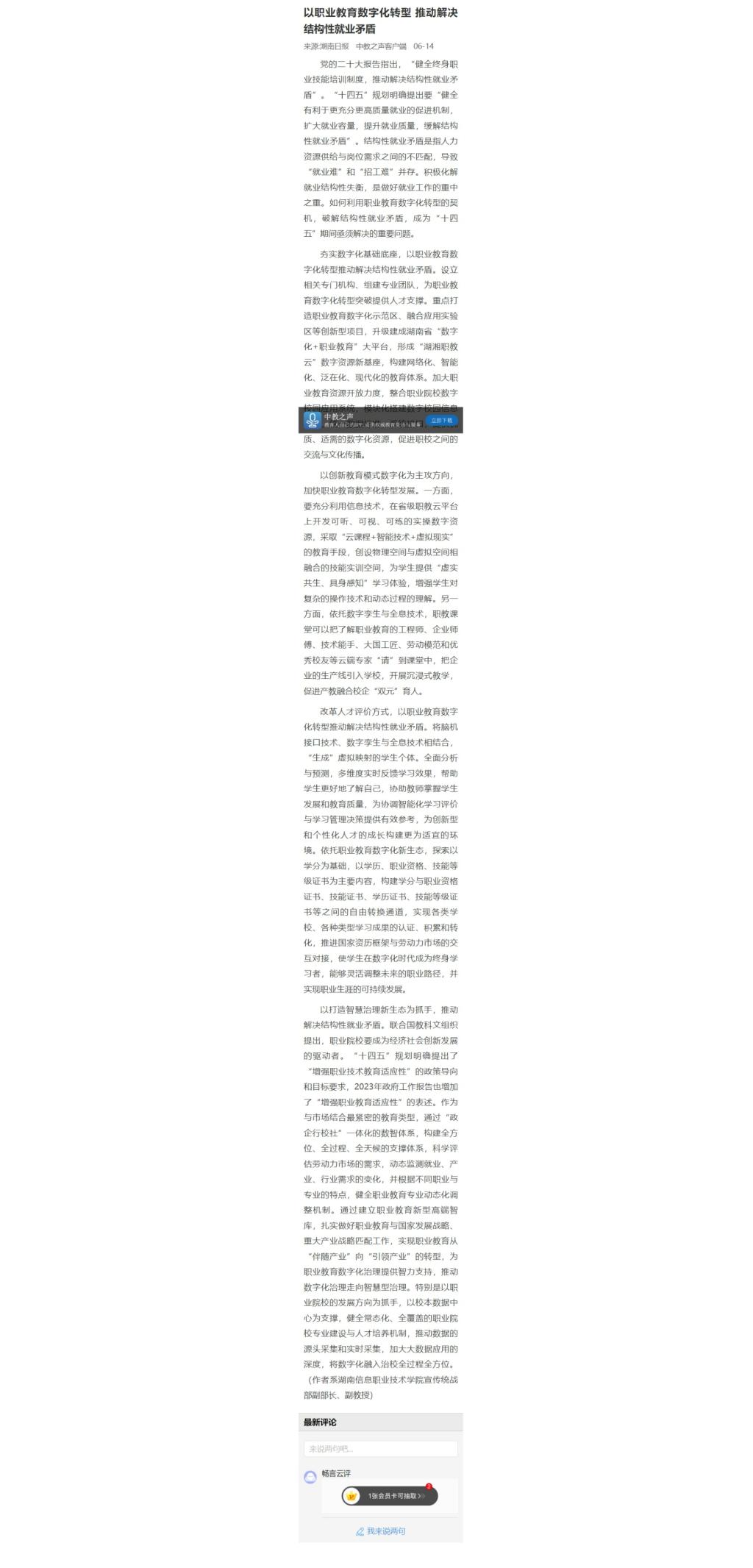 6月14日,中教之声客户端发布《以职业教育数字化转型 推动解决结构性就业矛盾》