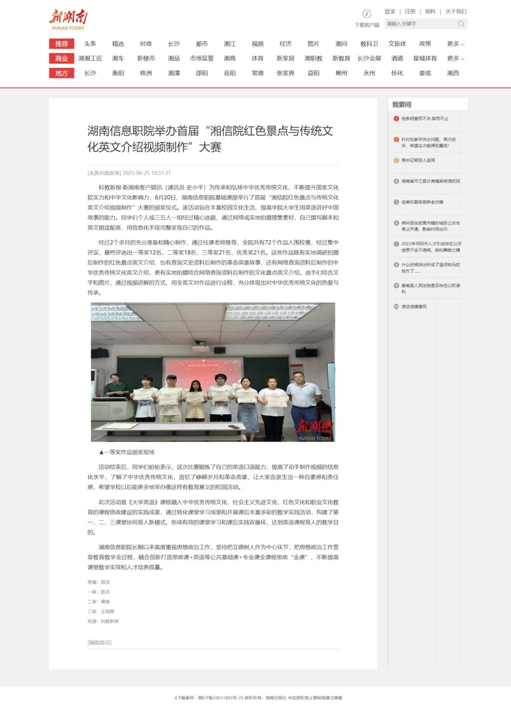 6月25日,新湖南发布《湖南信息职院举办首届“湘信院红色景点与传统文化英文介绍视频制作”大赛》