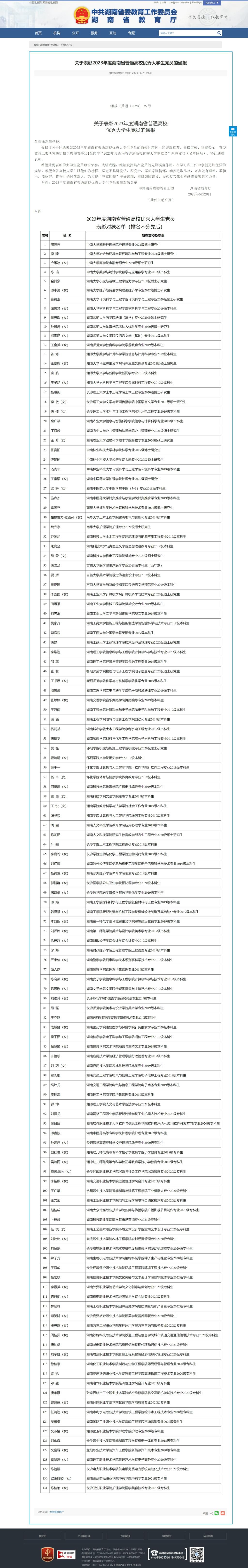 6月29日,湖南省教育厅发布《关于表彰2023年度湖南省普通高校优秀大学生党员的通报》