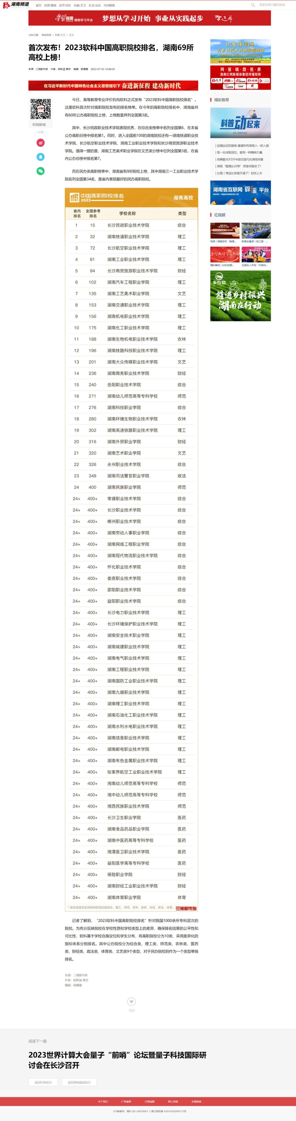 7月3日,红网发布《首次发布!2023软科中国高职院校排名,湖南69所高校上榜!》