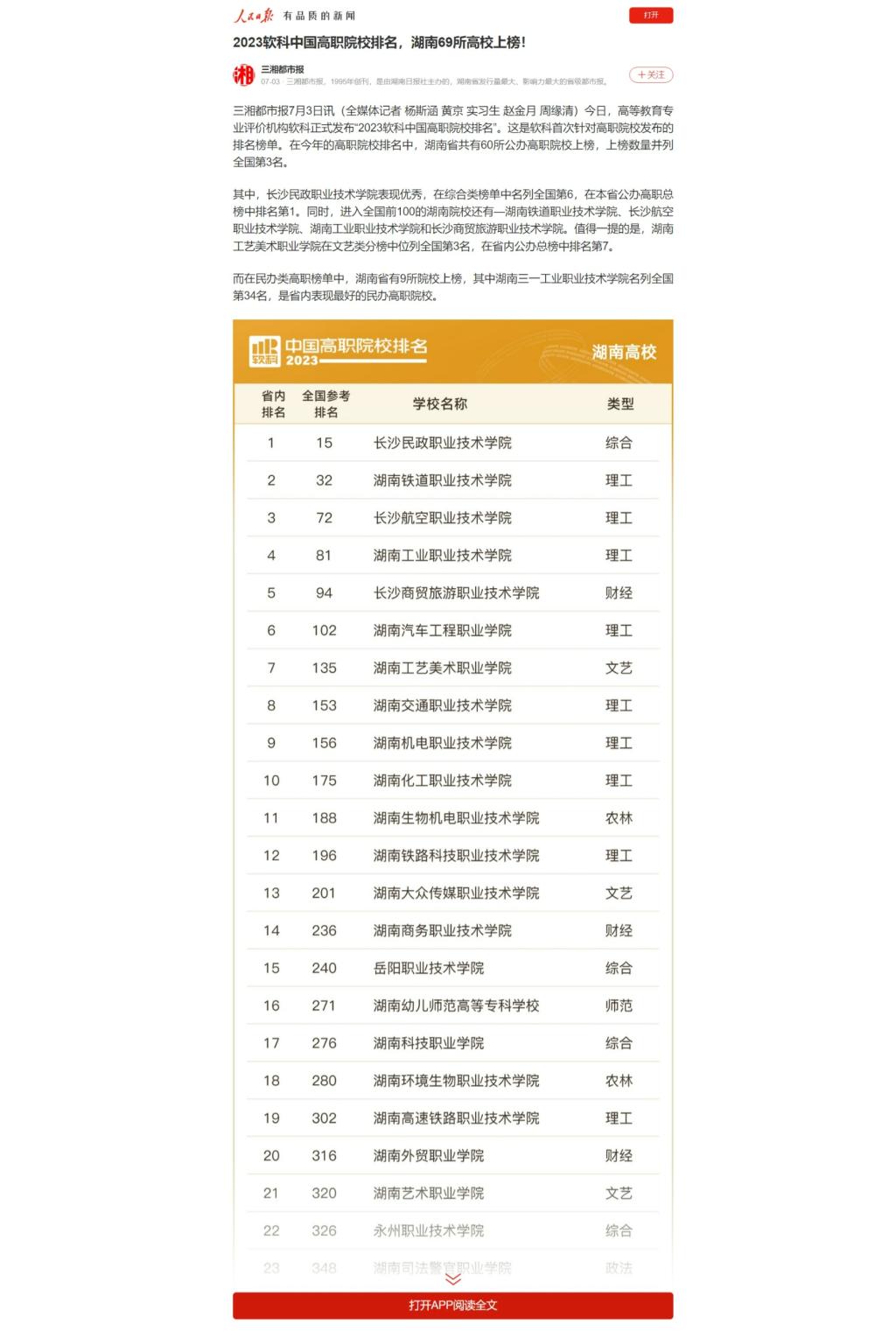 7月3日,人民日报人民号发布《2023软科中国高职院校排名,湖南69所高校上榜!》