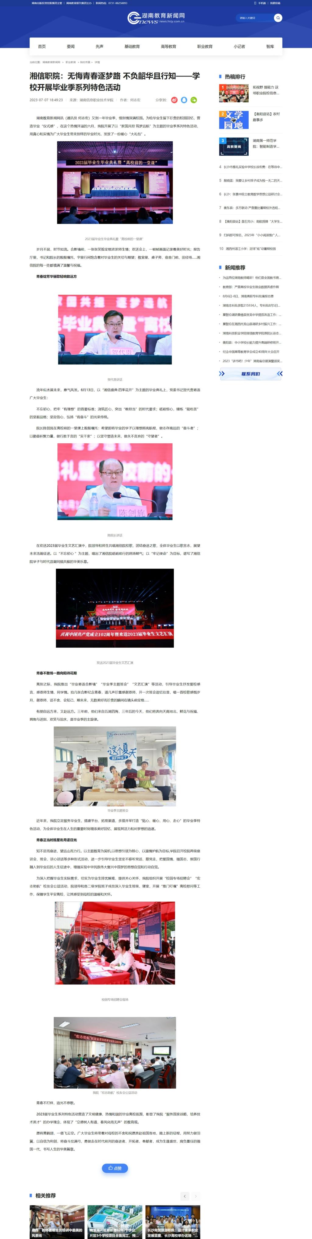 7月7日,湖南教育新闻网发布《湘信职院:无悔青春逐梦路 不负韶华且行知——学校开展毕业季系列特色活动》