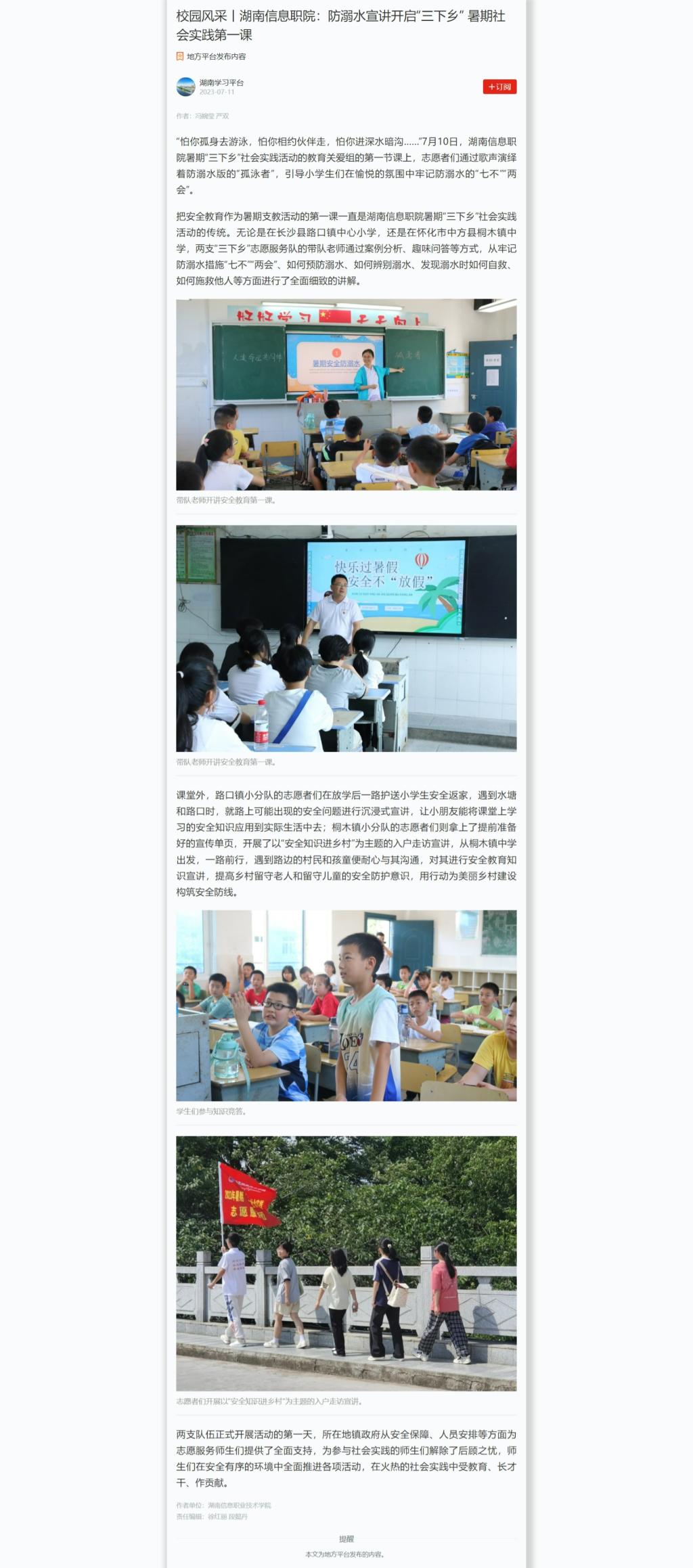 7月11日,学习强国发布《校园风采丨湖南信息职院:防溺水宣讲开启“三下乡” 暑期社会实践第一课》