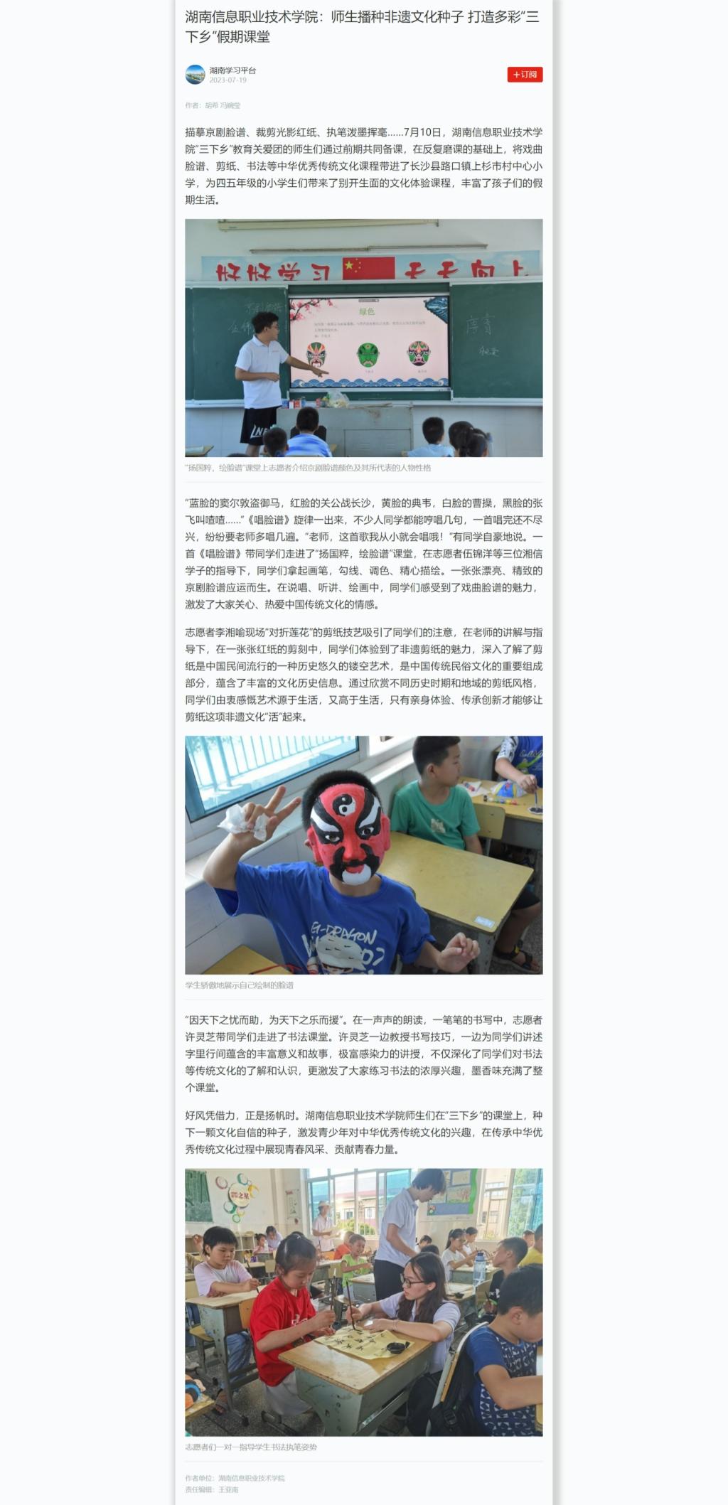 7月19日,学习强国发布《best365手机版官方网站:师生播种非遗文化种子 打造多彩“三下乡”假期课堂》